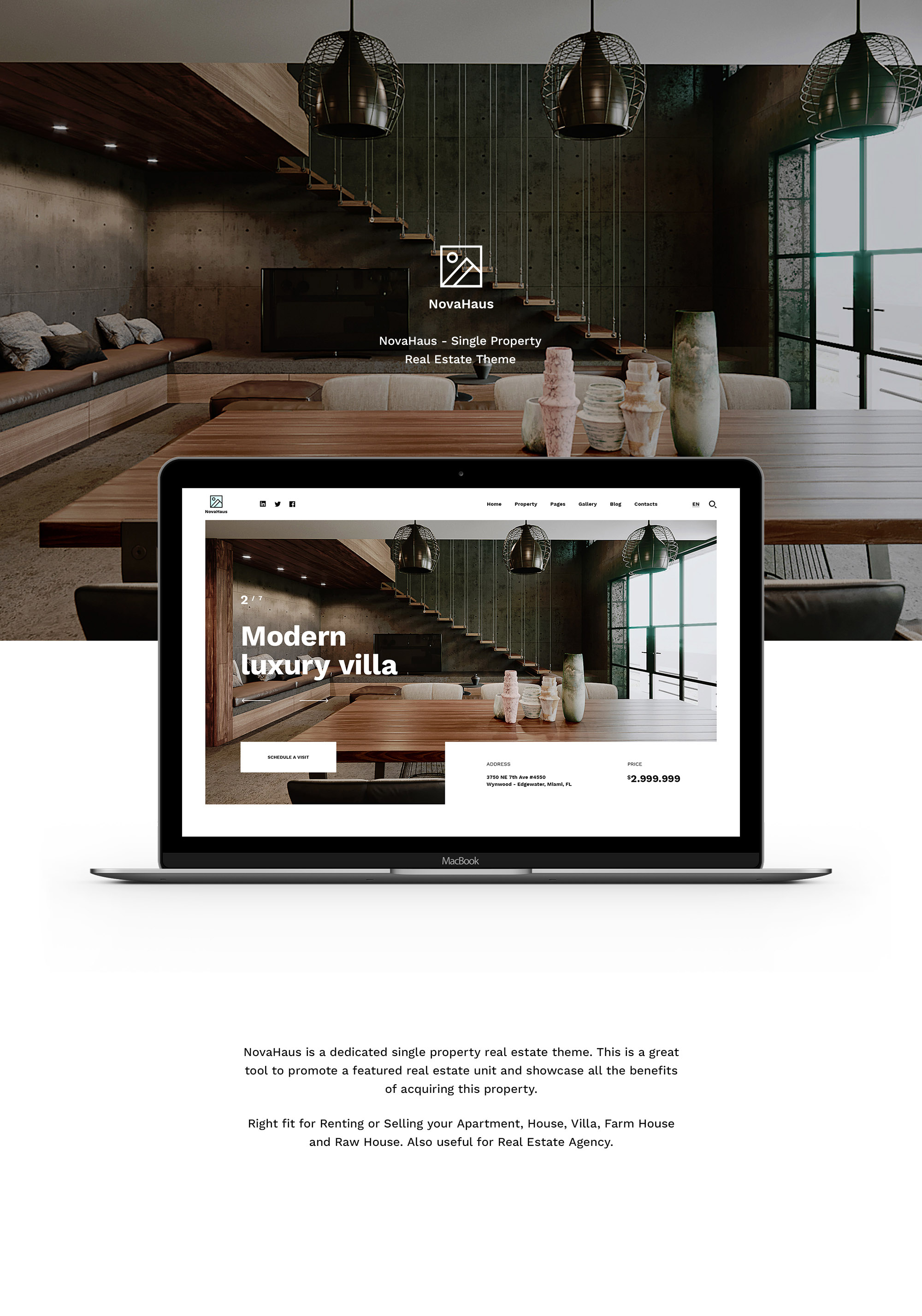 NovaHaus is a dedicated single property real estate theme. This is a great tool to promote a featured real estate unit and showcase all the benefits of acquiring this property.